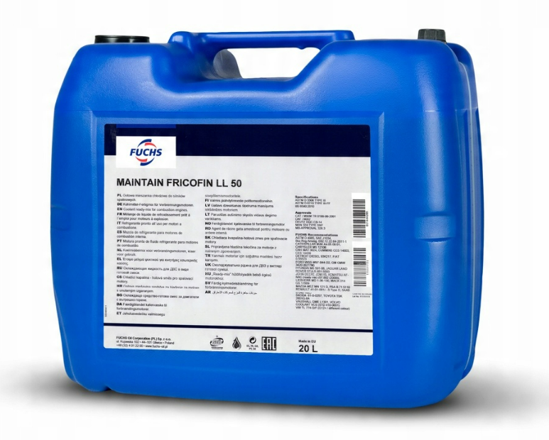 Fuchs Fricofin LL to niezawodny, niskokrzemianowy koncentrat płynu chłodniczego oparty na technologii OAT (Organic Acid Technology). Przeznaczony do nowoczesnych układów chłodzenia w silnikach benzynowych i wysokoprężnych. Produkt gotowy do rozcieńczenia – nie zawiera azotynów, amin, fosforanów ani boranów.