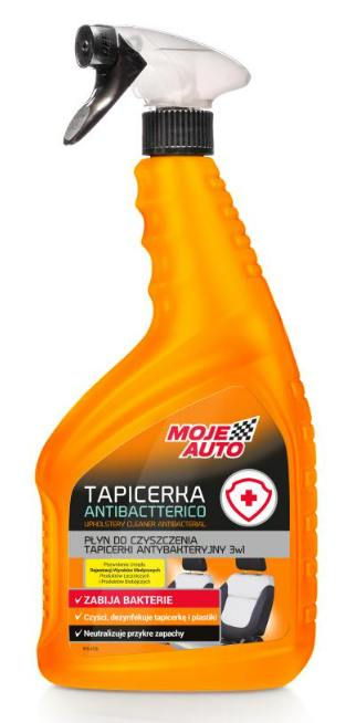 Środek do czyszczenia i dezynfekcji tapicerki Moje Auto Antibactterico 3w1 posiada właściwości bakteriobójcze i drożdżakobójcze (nr pozwolenia: 8048/20). Skutecznie usuwa zabrudzenia, dezynfekuje i eliminuje nieprzyjemne zapachy, zapewniając higieniczną czystość i bezpieczeństwo, szczególnie dla małych dzieci.